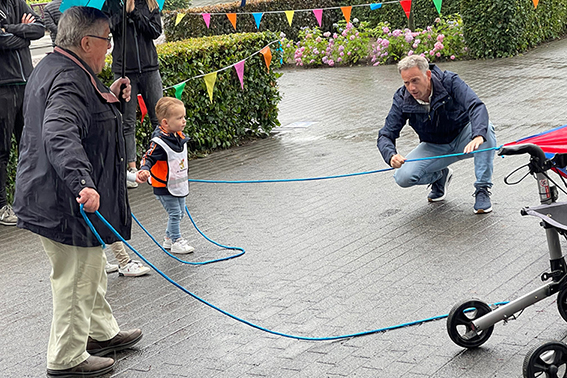 ,,De doelgroep voor deze fitroute is zo breed mogelijk”, zegt Zopfi voor De Willaert. Dat onderstreept hij door de opening te doen met een van de bewoners van De Willaert en twee van de jongste bewoners van Zundert, ‘klanten’ van kinderopvang Het Toverbloempje. Ze trekken een grote vlag van het informatiebord. De stromende regen mag de sportieve pret niet drukken.